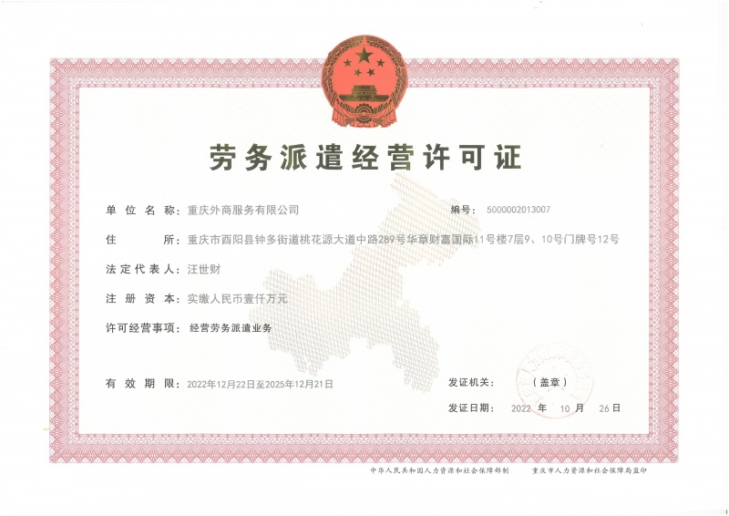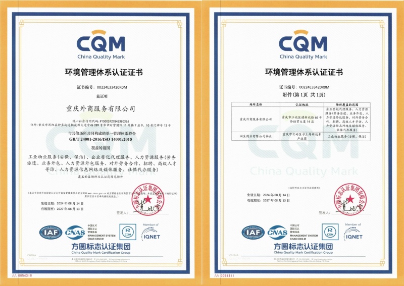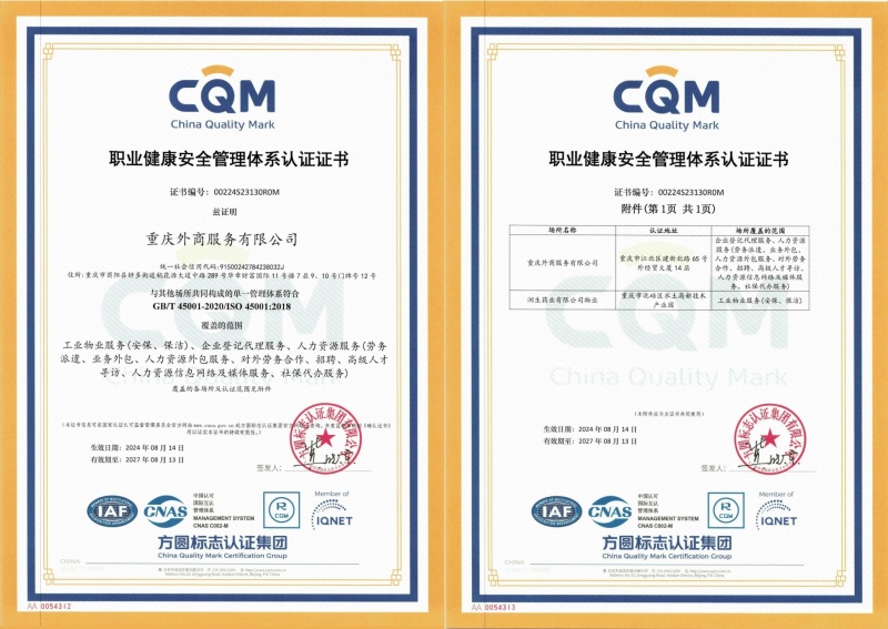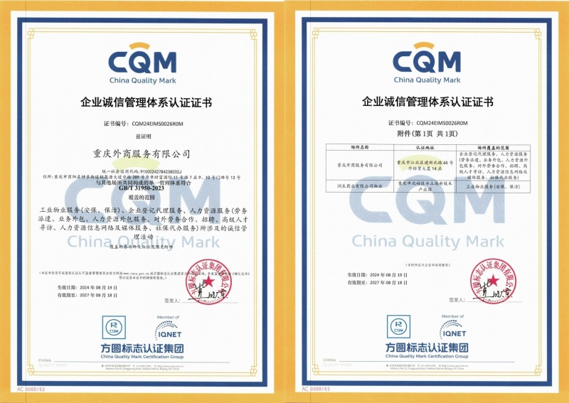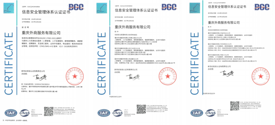 重慶外服具有完備的經(jīng)營服務(wù)資質(zhì),取得了人力資源服務(wù)許可證、勞務(wù)派遣經(jīng)營許可證、對外勞務(wù)合作經(jīng)營資格證書、代理記賬許可證書,擁有水、電、天然氣基礎(chǔ)業(yè)務(wù)外包、物業(yè)服務(wù)、重慶市高校畢業(yè)生就業(yè)實習(xí)基地等資質(zhì),通過了ISO9001:2015質(zhì)量管理體系、ISO45001:2018職業(yè)健康安全管理體系、ISO14001:2015環(huán)境管理體系、ISO27001:2022信息安全管理體系、GB/T31950-2023企業(yè)誠信管理體系認(rèn)證。 |